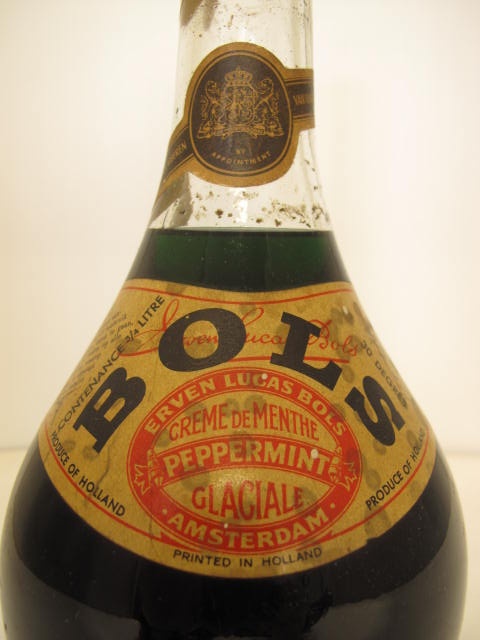 Creme de Menthe - Clear glass - Flask bottle with long neck - Red cap - Tax paper seal of the King