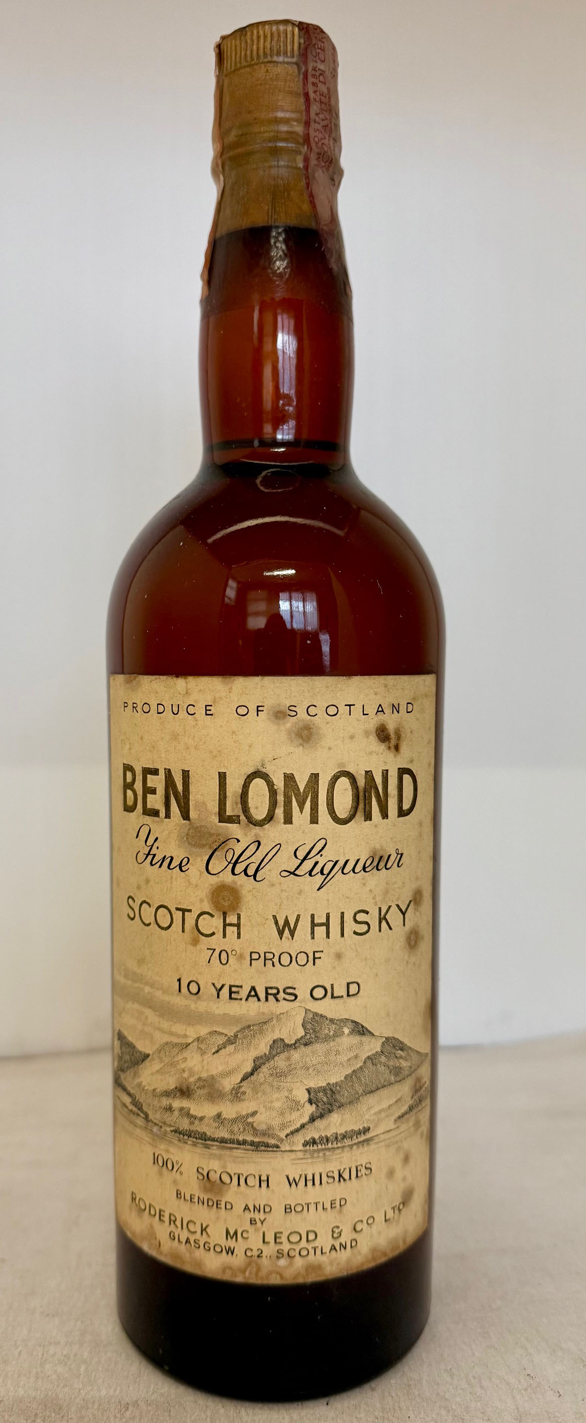 Dark glass - Dumpy bottle - Cream label - Cork drive - Cream capsule - Distilled by D.G. Mackenzie & Co