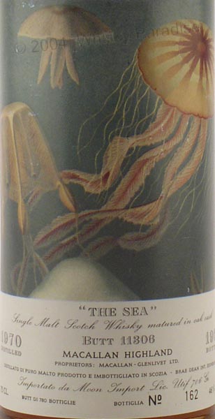 Description: "The Sea" collection - Butt 11306 - Clear glass - Tall bottle - Painting label - Gold capsule - Moon import (Italy)