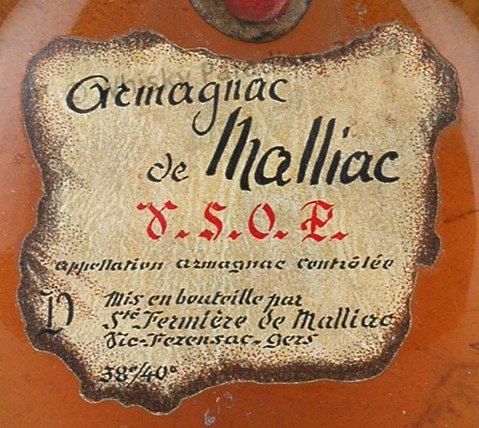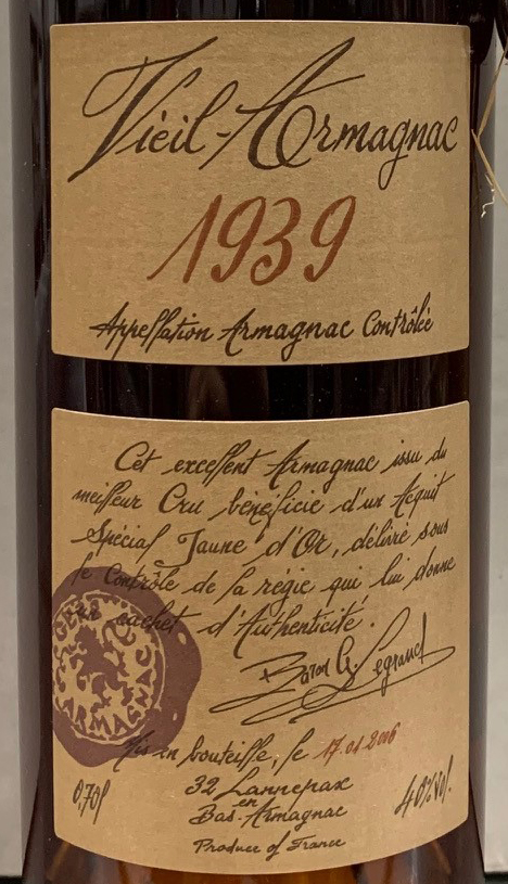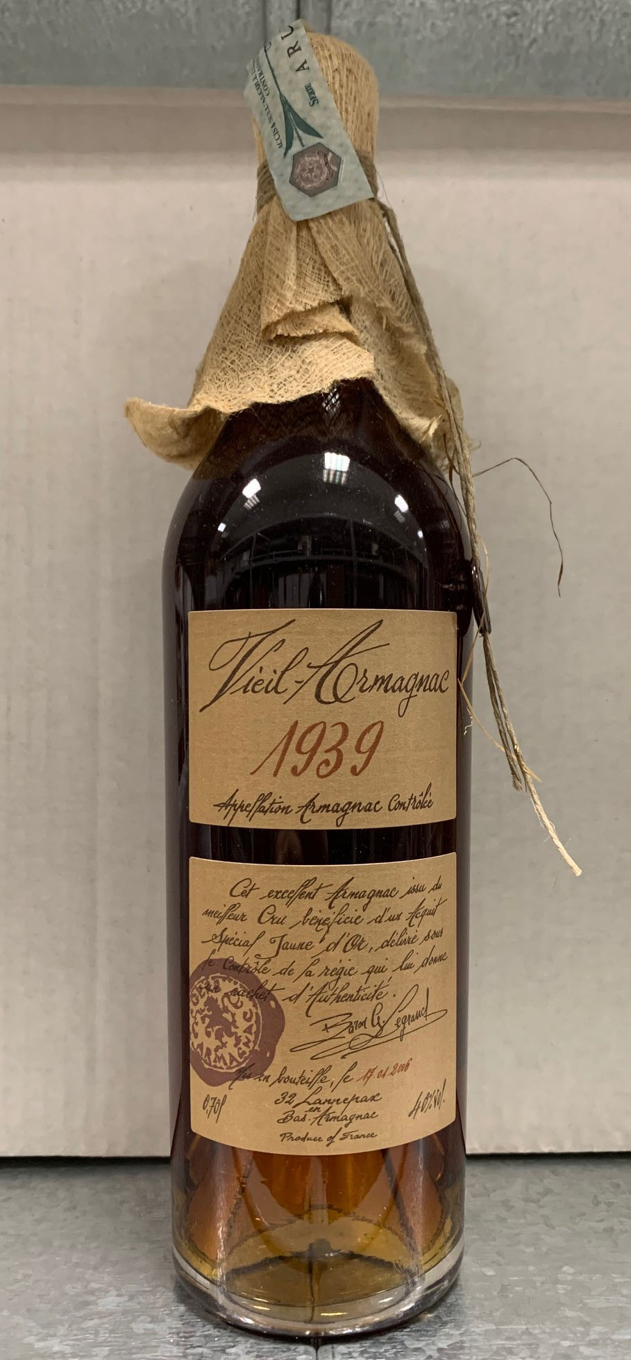 vìeil Armagnac 1939 - Clear glass - Tall bottle - Light brown label - Jute cap cover fixed to the wax seal
