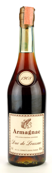 1908 - Tall bottle - Blob seal - Rounded neck label with distillation year - Gold capsule