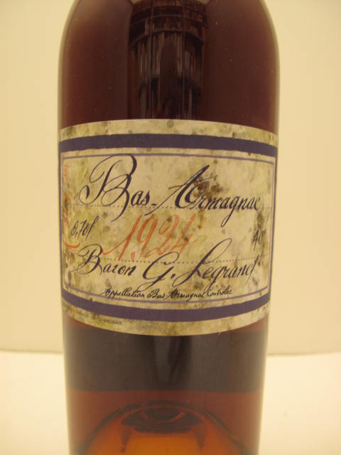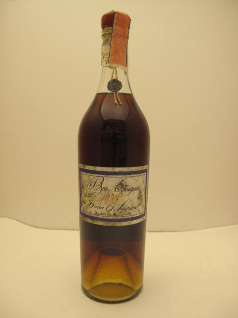 Bas Armagnac 1924 - Clear glass - Tall bottle - Clear handwritten label - Cork drive with cloth on the cap and tax seal