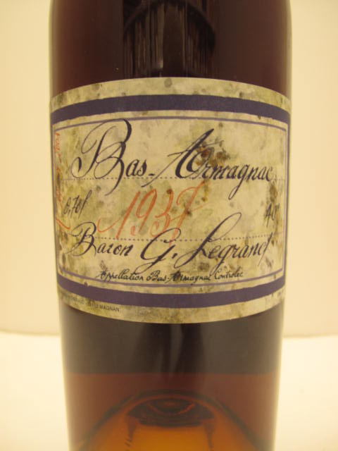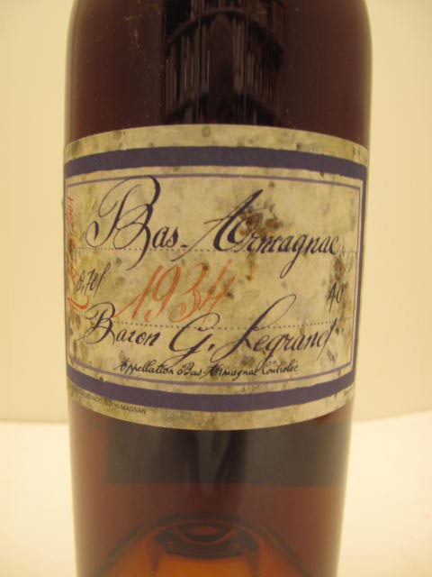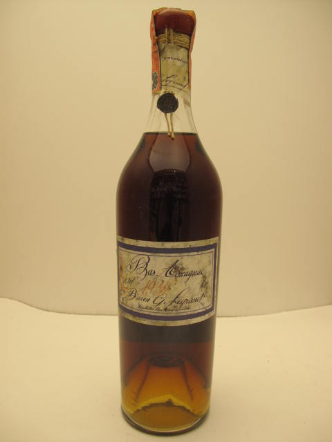 Bas Armagnac 1934 - Clear glass - Tall bottle - Clear handwritten label - Cork drive with tax seal