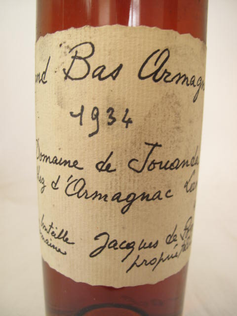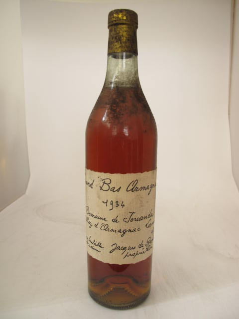 Grand Bas Armagnac - Vintage 1934 - Clear glass - Cream label printed black - Cork drive - Dark capsule