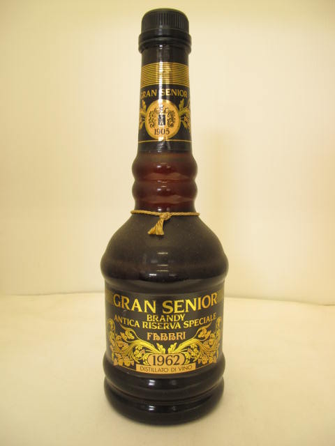 Grand Senior Brandy - Antica Riserva Speciale - Dark glass - Dumpy bottle - Long neck with two ring - Dark label printed in gold with distillation year - Dark plastic cap