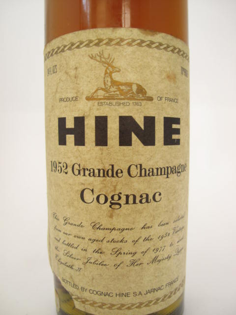 1952 Grande Champagne Cognac - To celebrate the Silver Jubilče of Elizabeth II - Clear glass - Tall bottle - Cream label printed in black - Cork drive - Gold capsule