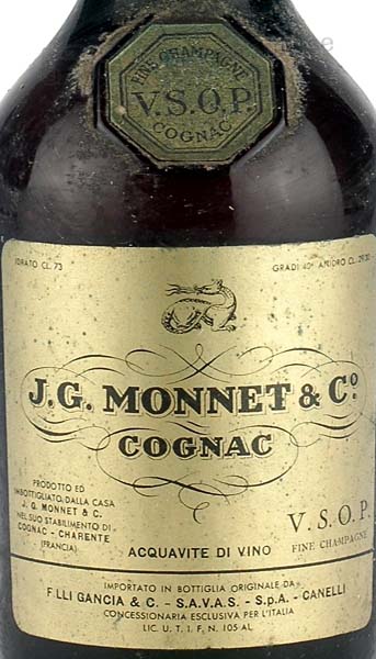 VSOP Fine champagne - Green glass - Dumpy bottle - Gold label printed in black - Blob seal - Gold screw cap - F.lli Gancia import (Italy)