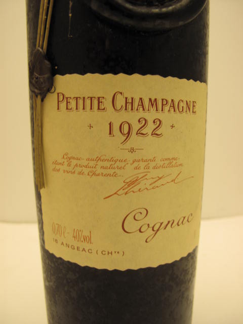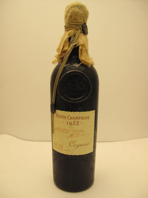 Petite Champagne Cognac 1922 -Dark glass - Tall bottle - Cream label - Cloth around the cap with wax seal - Blob seal