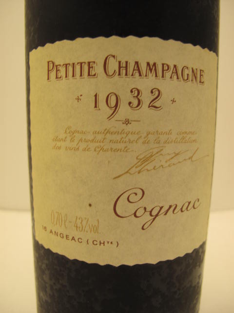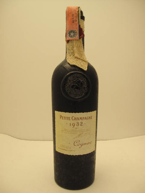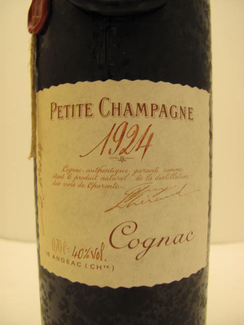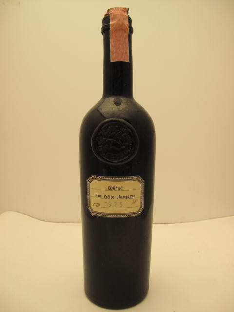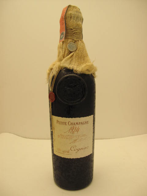 Petite Champagne Cognac 1924 - Dark glass - Tall bottle - Cream label - Cloth around the cap with wax seal - Blob seal