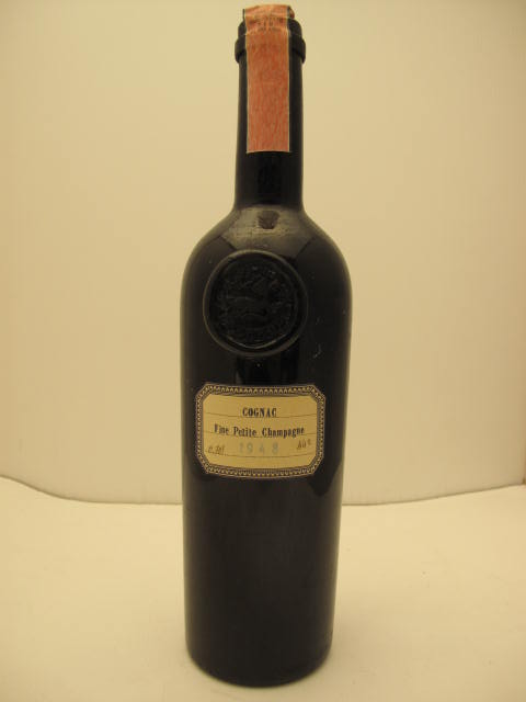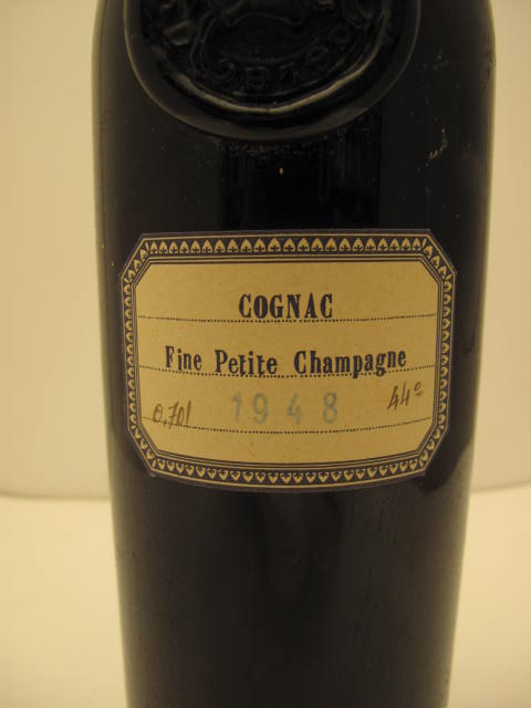 Petite Champagne Cognac 1948 -Dark glass - Tall bottle - Cream label - Cloth around the cap and wax seal - Blob seal