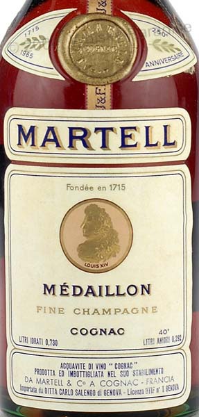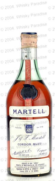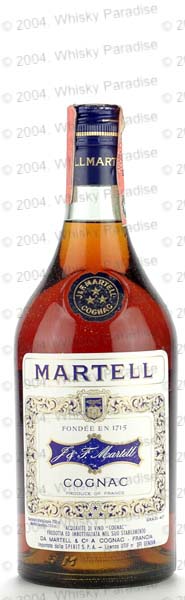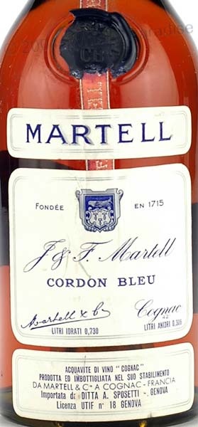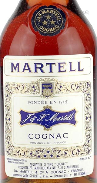Clear glass - Three stars cognac - White label - Blue screw cap printed in gold - Rounded shoulder seal - Spirit SPA import (ITA)