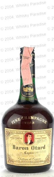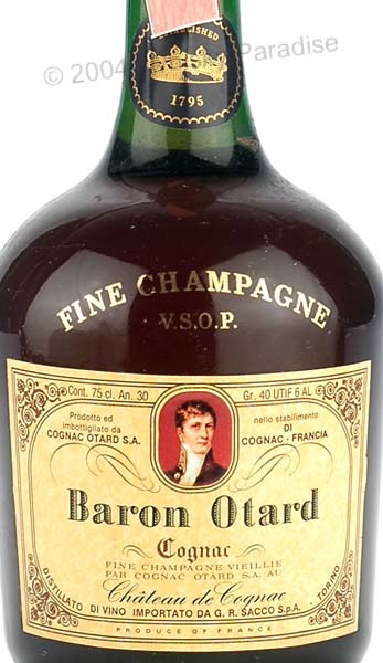 Baron Otard VSOP - Green glass - Dumpy bottle long necked - Portrait in cream label printed in black - Gold rows stencilled - Black screw cap - Sacco import (Italy)