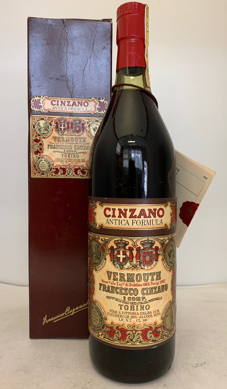 Vermouth - Clear glass - Tall bottle - Early label - Cork drive - Red capsule - Hang tag
