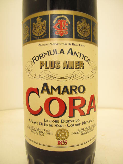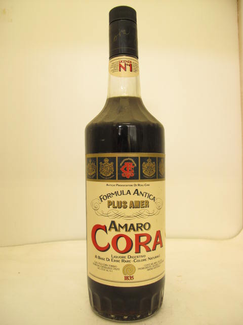 Amaro Cora - Clear glass - Tall bottle with fluted neck - Cream label - Dark plastic cap