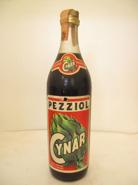 Pezziol - Clear glass - Tall liter bottle - Artichoke in red label - Gold plastic cap