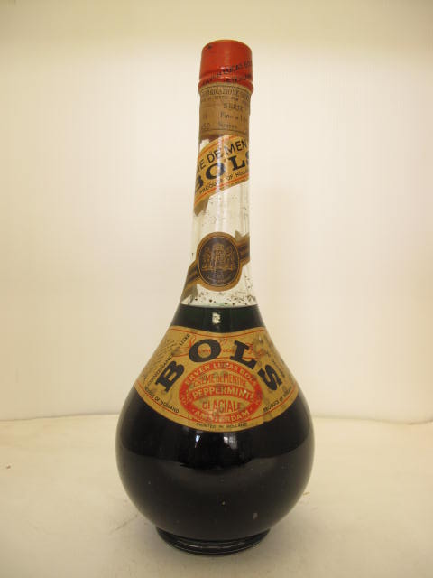 Creme de Menthe - Clear glass - Flask bottle with long neck - Red cap - Tax paper seal of the King