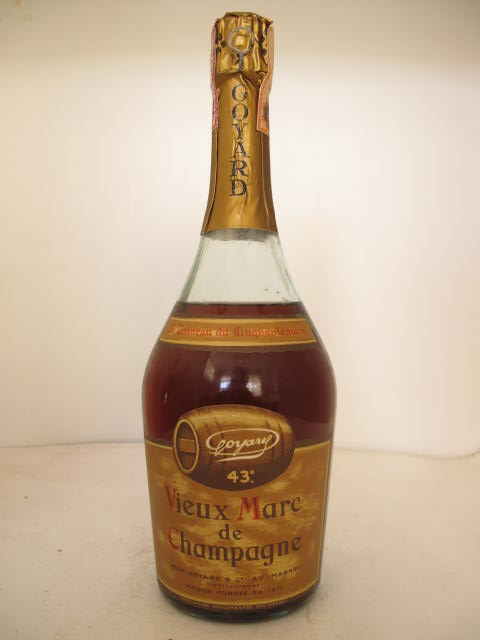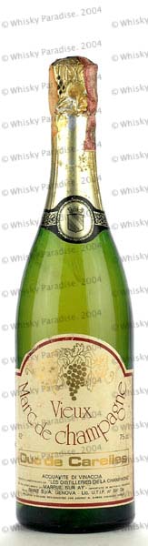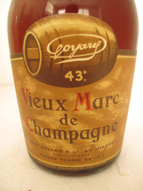 Vieux Marc del Champagne - Clear glass - Dumpy bottle - Barrel picture in brown label - Cork drive - Muselet cage - Lead capsule