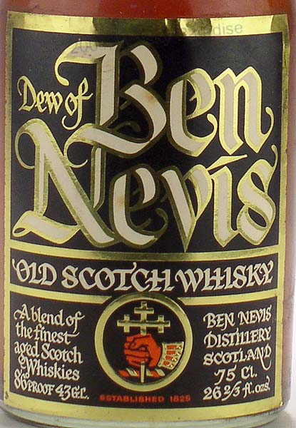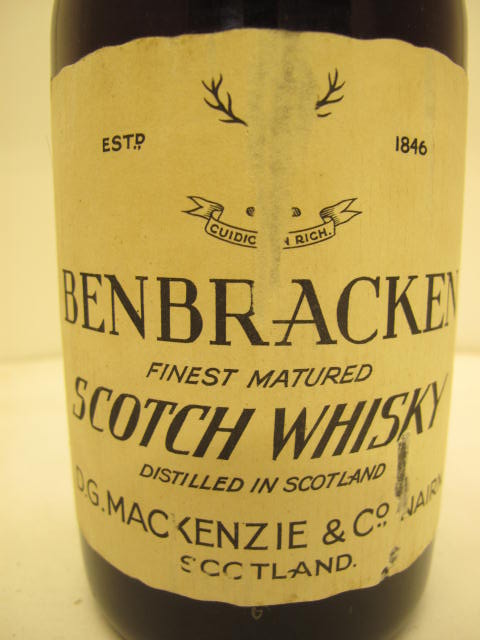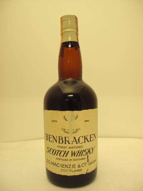 Dark glass - Dumpy bottle - Cream label - Cork drive - Cream capsule - Distilled by D.G. Mackenzie & Co