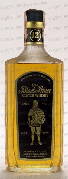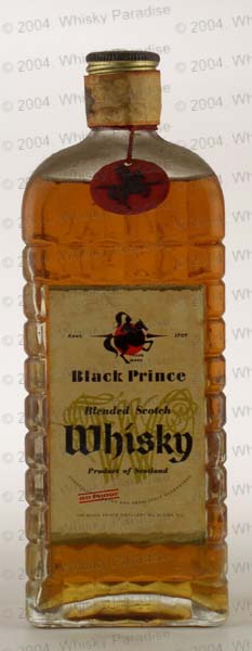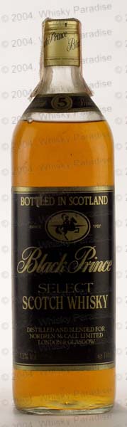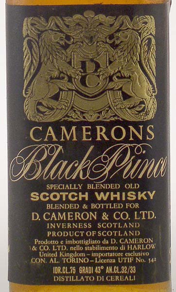 Clear glass - Square bottle short necked - Black label gold framed printed in gold - Black knight in gold oval - Gold screw cap