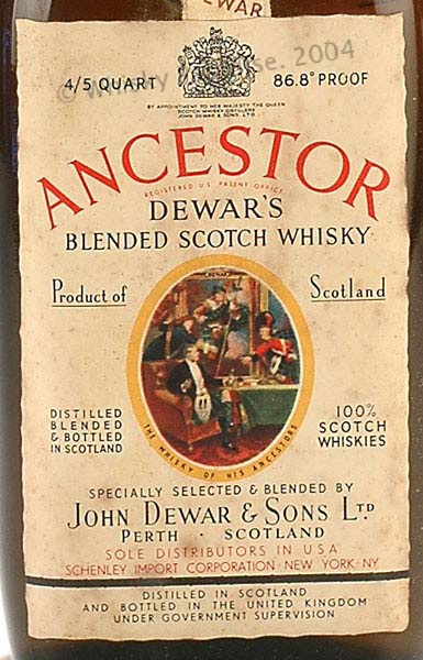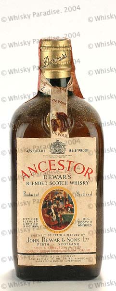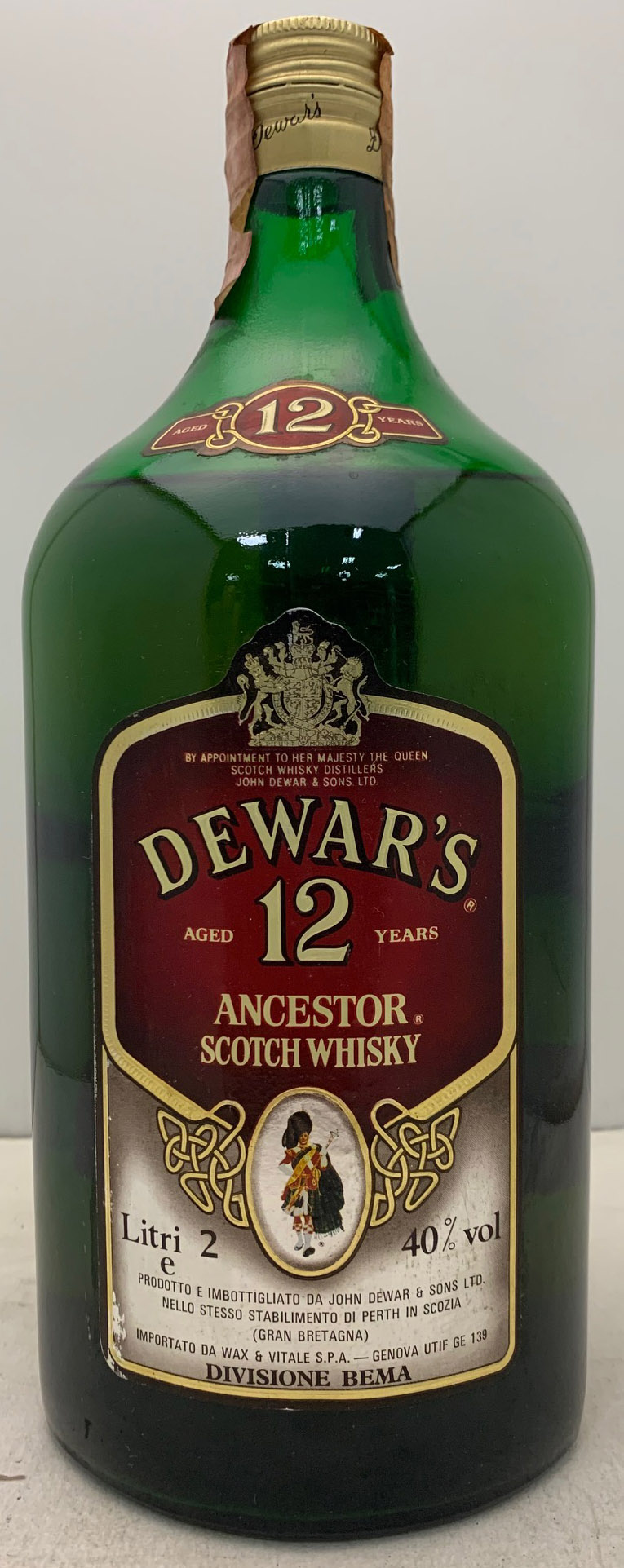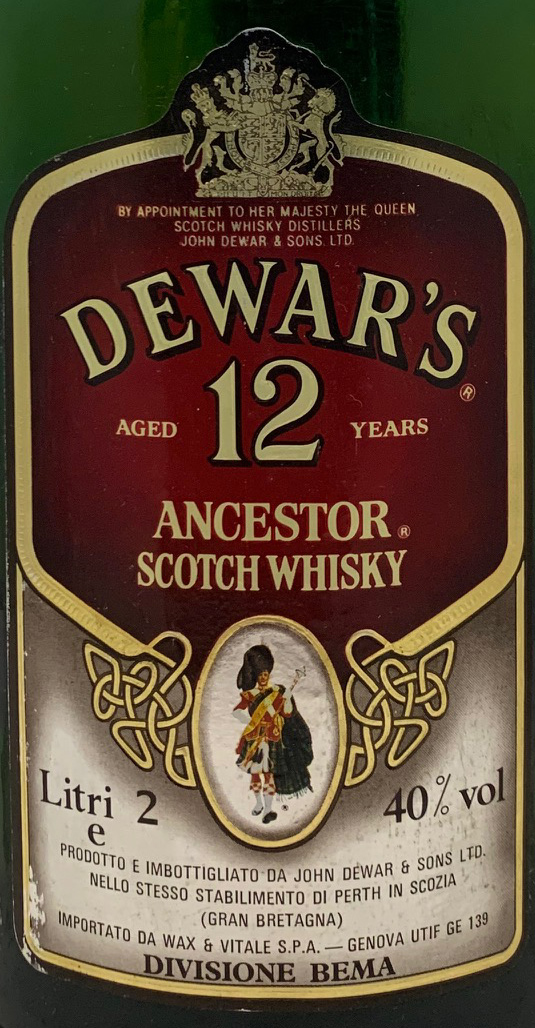 Dewar's Ancestor - Green glass - Big bottle - Age in main label - Piper's picture - Age in shoulder label - Gold screw cap - Wax & Vitale (ITA)