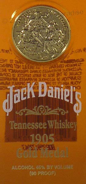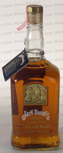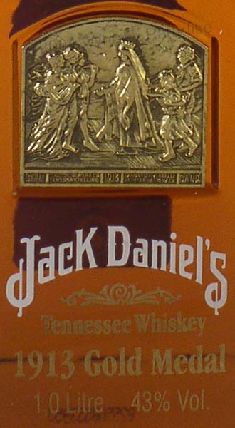 1905 Gold Medal - Clear glass - Square close bottle - White brand & gold rows stencilled on the glass - Gold plate in embossed circle - Black hang tag