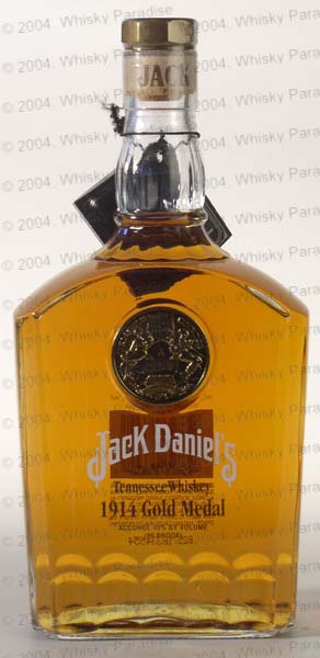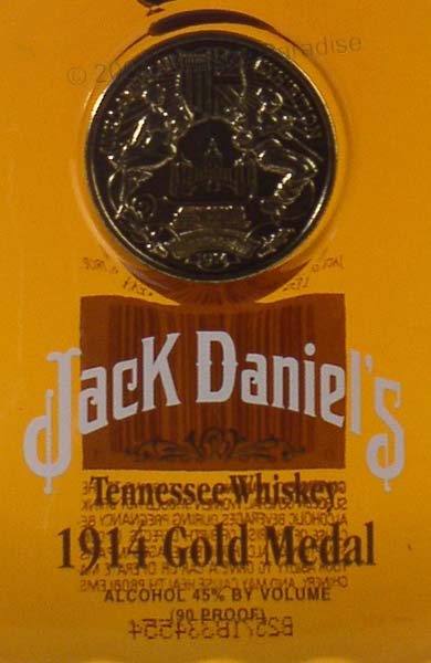 1914 Gold Medal - Clear glass - Rectangular decanter with chamfered corners- Gold plate in embossed circle - White brand and black row stencilled - Black hang tag