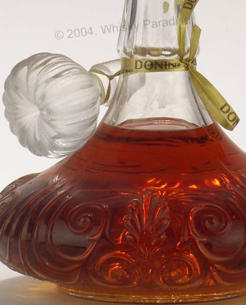 Clear glass - Tall bottle - Cream label printed in black & red - Gold cap