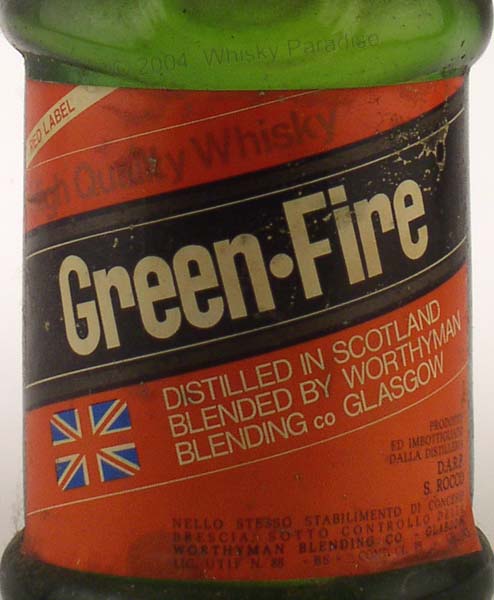 Green glass - Dumpy bottle with large squat shoulder & base - Red label with black diagonal stripe - Black cap - Blob seal