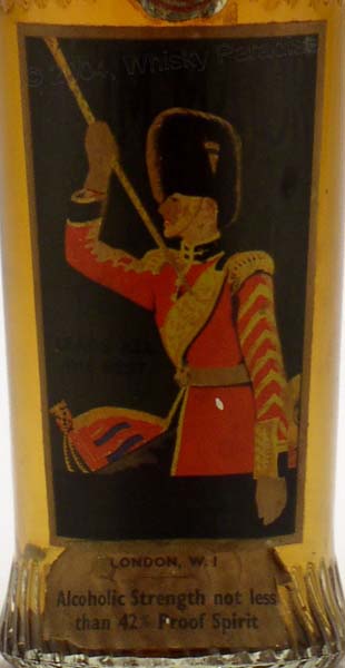 Clear glass - Tall bottle with swirled ridge on large shoulder - English guard in black label - Ribbon & seal - Bronze cap