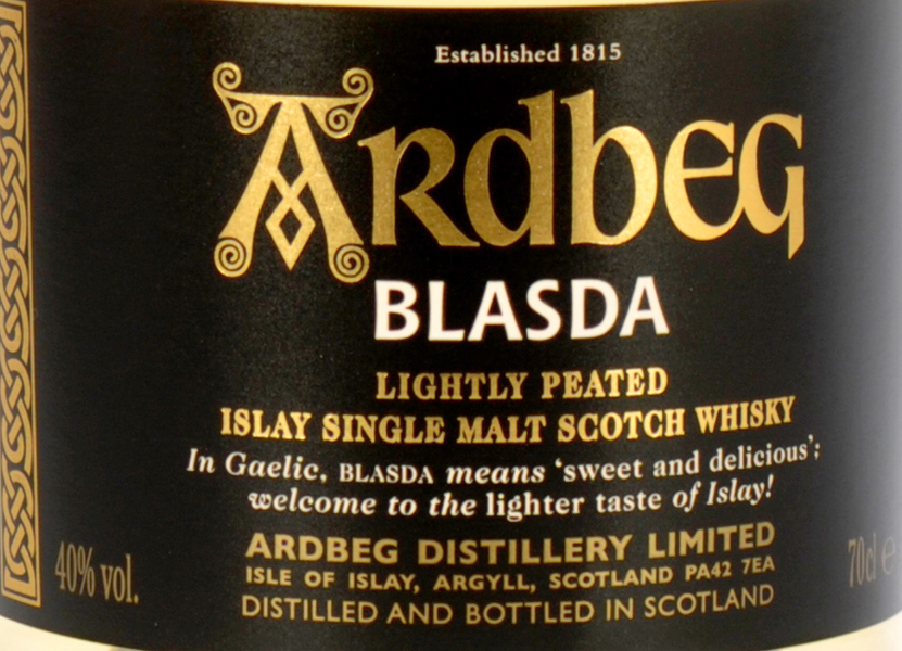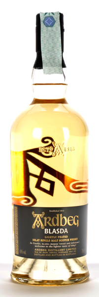 "Blasda" - Lightly Peated - Clear glass - dumpy bottle - black label printed in white & gold - embossed row - "A" stencilled - cork cap with black capsule