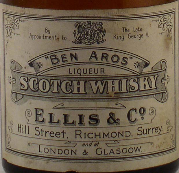 Old Bannf - Black glass - Dumpy bottle - Cream label printed in black - Distillery picture in oval - Bronze cal