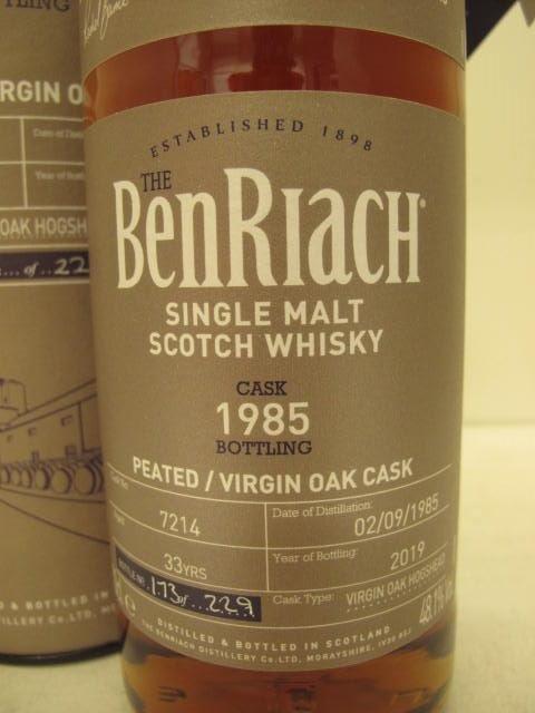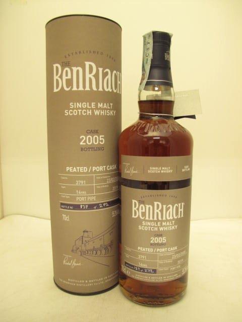 Single cask malt - Peated\Port cask - Clear glass - Light brown label - Cork drive - Black capsule - Hang tag