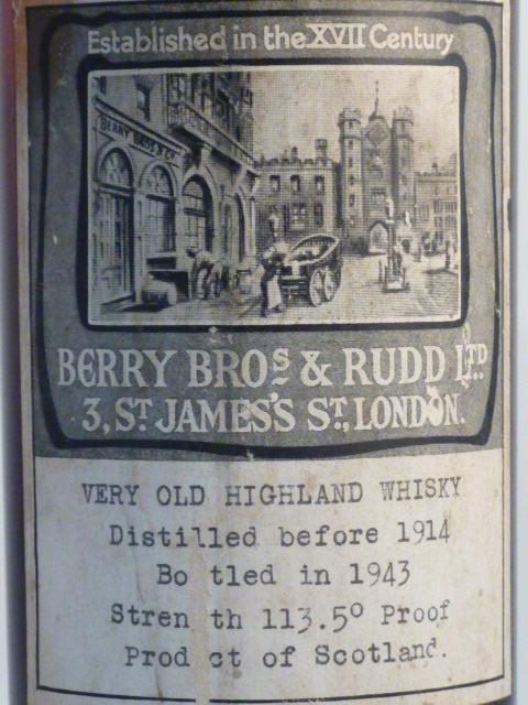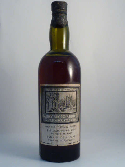 Distilled before 1914 - Classic early Berry Bros & Rudd label - Cork type - Black capsule - Strength 113.5°