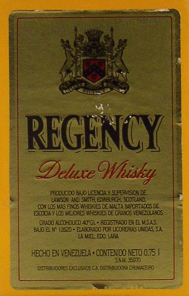 Venezuelan Whisky - Clear glass - Rectangular bottle - Gold label printed in black - Gold cap
