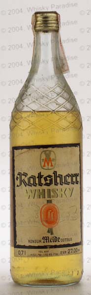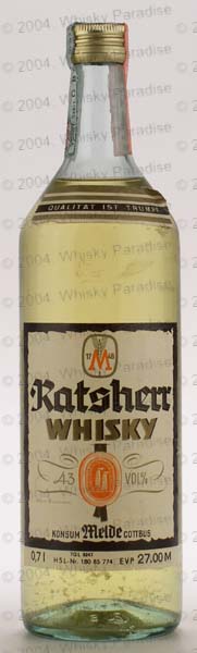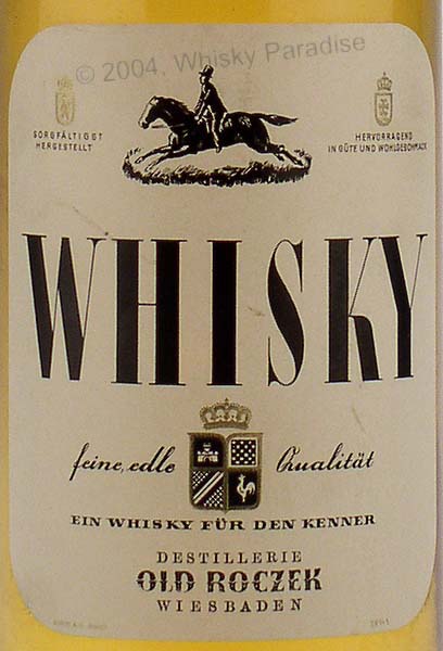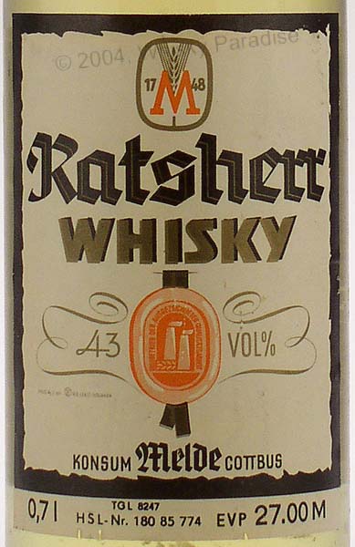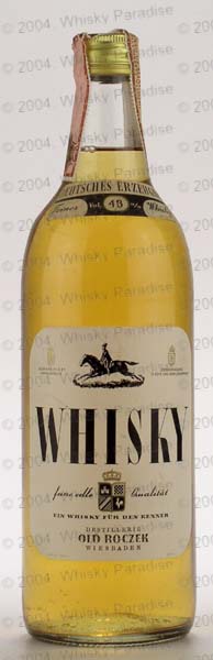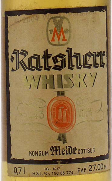 German whisky - Clear glass - Tall bottle with criss crosses ridge on the shoulder - Cream label black framed - Gold screw cap