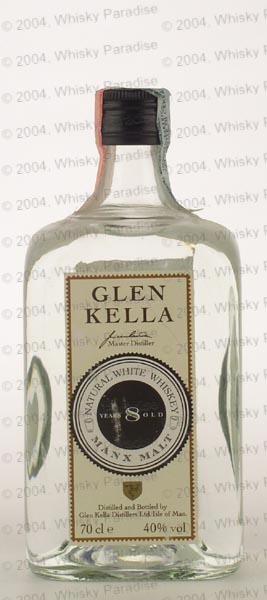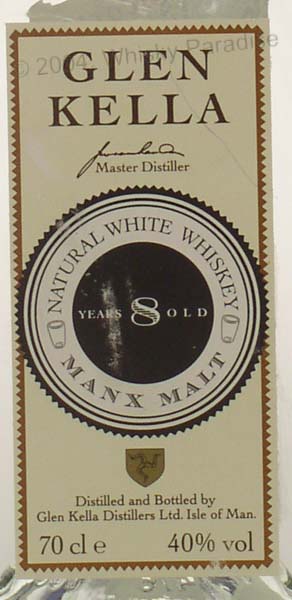 Manx malt - Natural white whisky - Clear glass - Rectangular bottle - Black print inwhite label with age in black rounded circle - Black screw cap