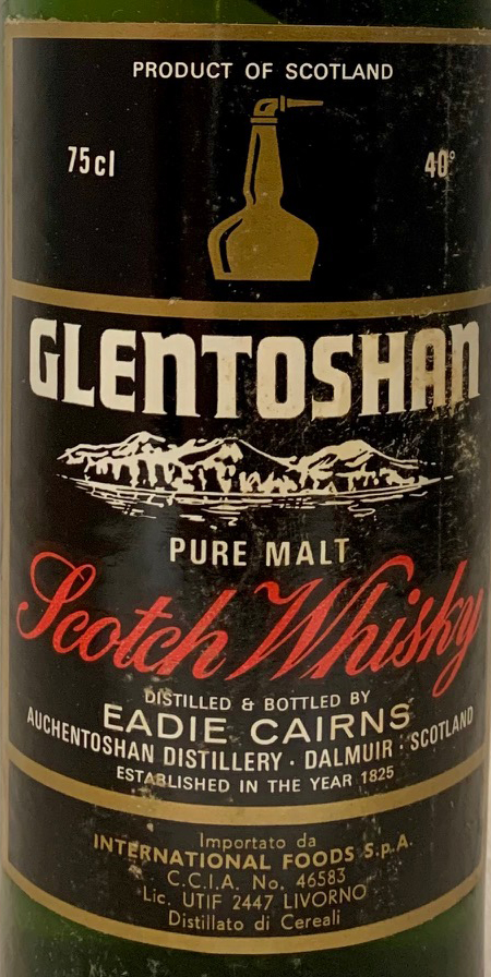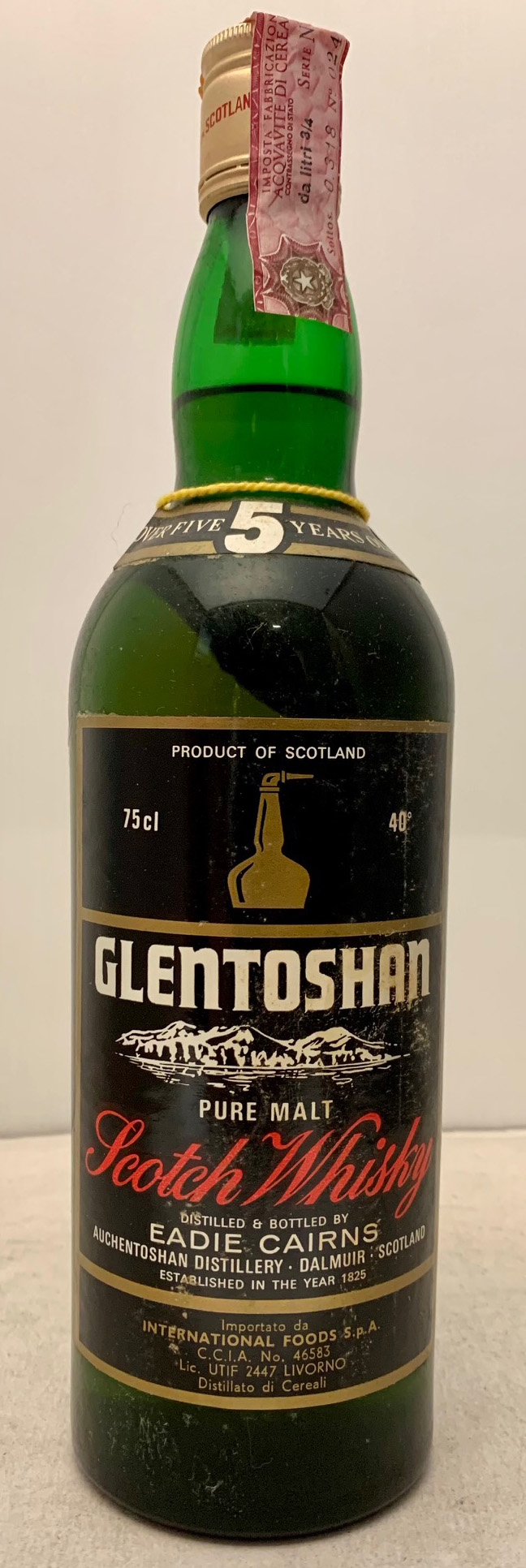 Green glass - Tall bottle - Black label - Age in shoulder label - Gold screw cap - International Foods import (ITA)