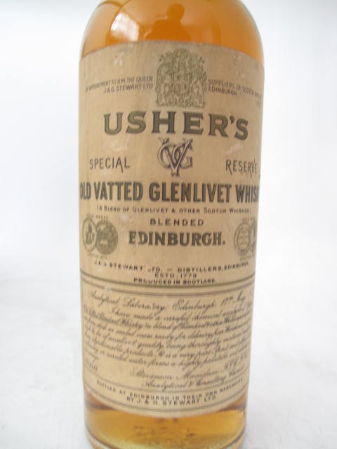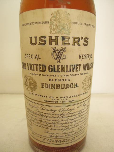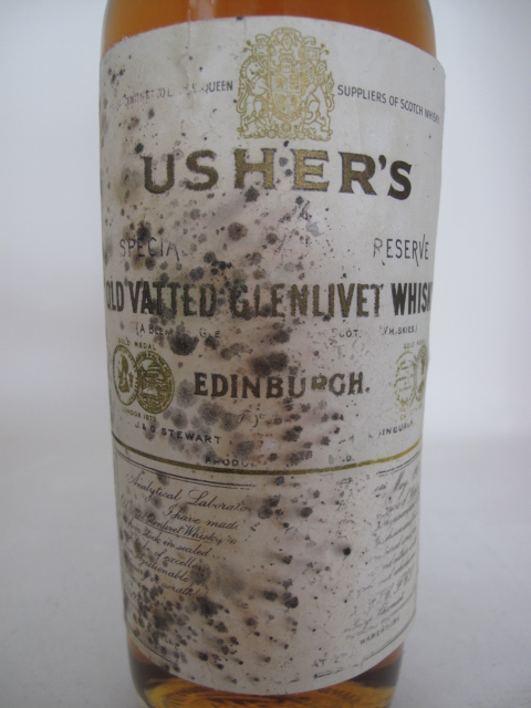Old vatted Glenlivet Whisky - Special reserve - Clear glass - Tall bottle - Gold/black print in cream label - White cap
