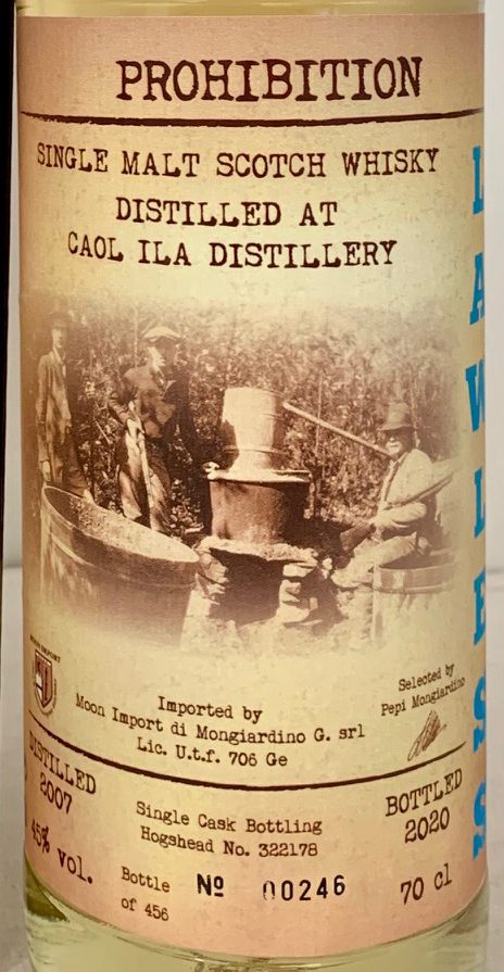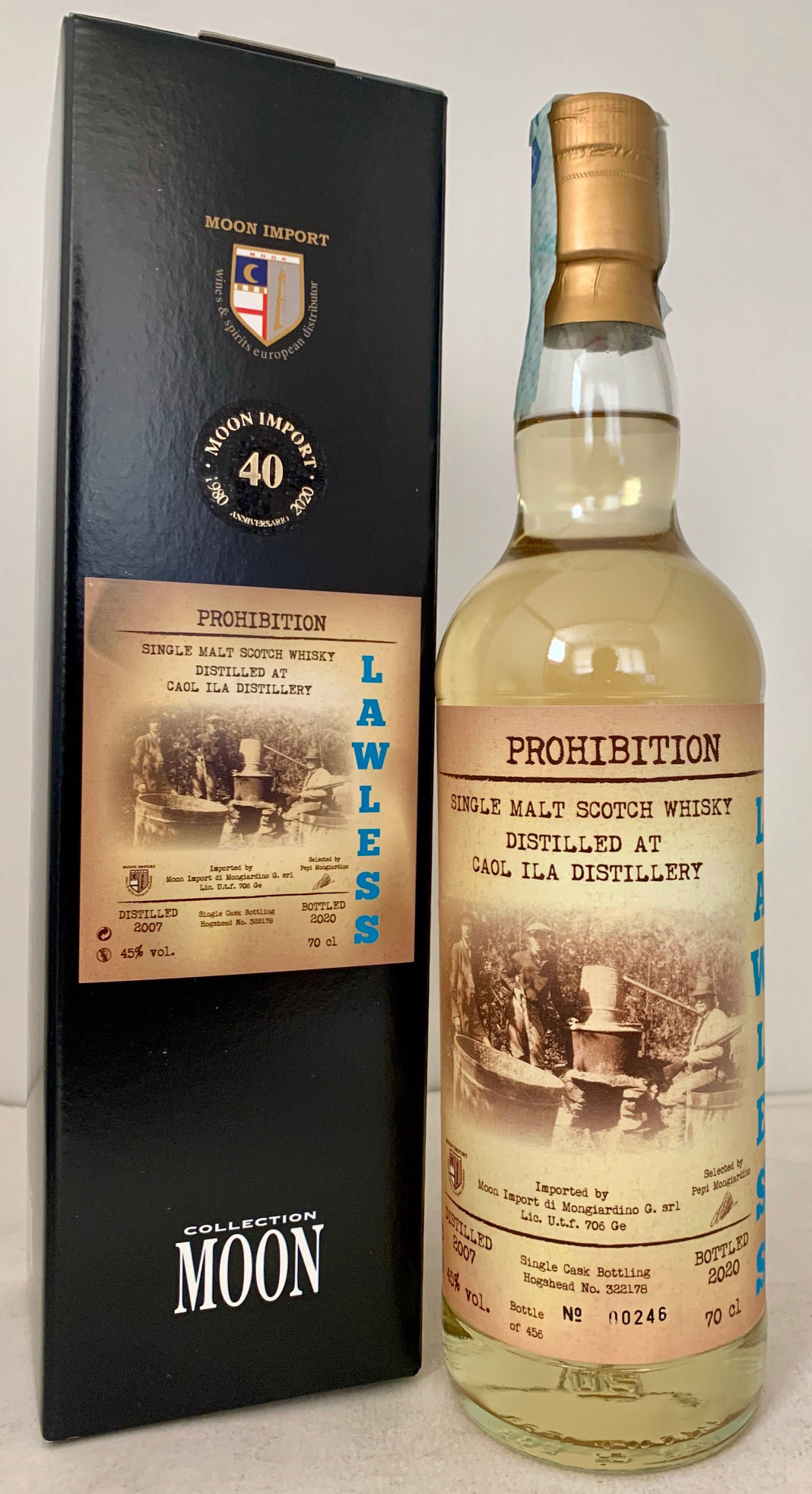 Lawless collection - Prohibition - Selected by Pepi Mongiardino - Single cask bottling - Hogshead 322178 - Limited of 456 btls - Clear glass - Tall bottle - Early photo in cream label - Cork drive - Gold capsule - Moon Import (ITA)