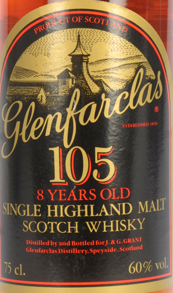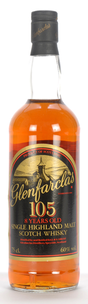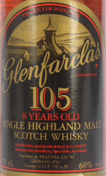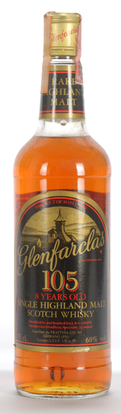 "105" - Clear glass - tall bottle - Gold & red print in black label - Distillery chimney image - gold cap - Frattina import (Italy)