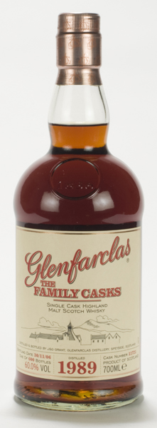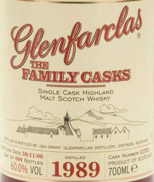 The Family Casks - 1989 - Single cask malt (Cask 11721 - 600 bottles) - Clear glass - Dumpy bottle - Blob seal - Cream label printed in red - Distillery picture