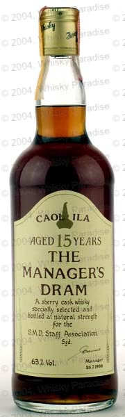 Manager's Dram - Clear glass - Tall bottle - Cream label printed in black & red - Gold screw cap